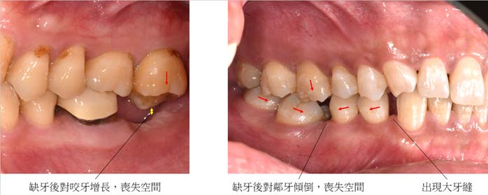 當一顆牙齒喪失,除了可能造成咀嚼、清潔不便,影響美觀及發音外,更重大的影響其實是缺牙空間將導致鄰牙傾倒,對咬牙增長,可能進一步造成咬合垂直高度喪失及前牙暴出,後續贗復也將會是一大工程,可能要配合矯正治療或修磨鄰牙、對咬牙甚至根管治療。