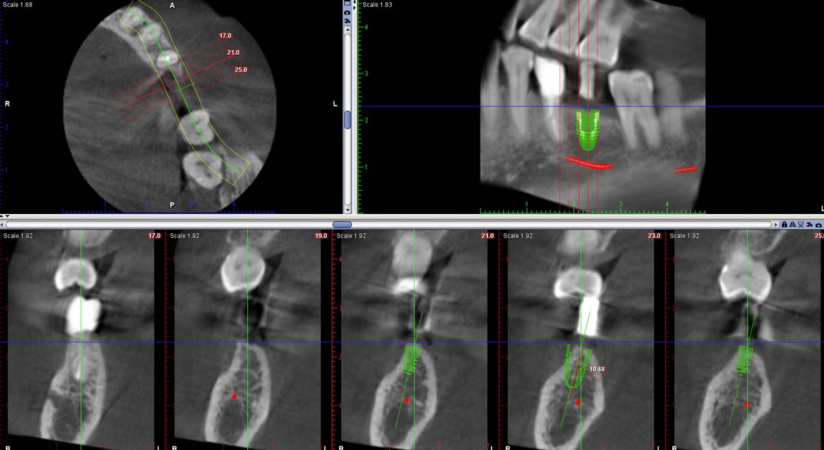 首先我們須先看斷層掃描中,假想牙齒下方植體出落的位置周圍是否有合理的骨頭包圍?在下顎,植體長度受限於下顎齒槽神經管的位置,那麼植牙跟隨咬合角度放入後,是否有理想或合理的長度寬度就很值得先思考。