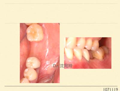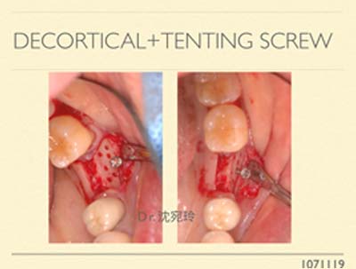 像如下的case植牙長度只能放到8 mm,再多就可能撞到神經管,這時候植體寬度就很重要,以第一大臼齒最好有5.5mm以上較安全,以迎接在咬合功能行使上的力量。那麼換算骨寬度,為加上植體的頰舌側左右需有2 mm,理想在牙脊寬度一共需9.5 mm以上,等同於現況植入後有大半是露出來的,為保守起見,我們常常先補一次骨粉和再生膜,另外在再生膜下方搭一德國帳棚釘,以維持住新骨頭生長的空間。