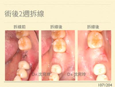 這裡隱藏最重要的事是,補進去的骨頭要能被肉『包起來』,那麼翻瓣後的『鬆弛』就很吃功夫啦!還要能做到縫合後不血呼呼,以及術後疼痛度低。若回診時,病患說『我一顆止痛藥都沒吃,不痛啊!』那就是手術醫師最欣慰的事了!!