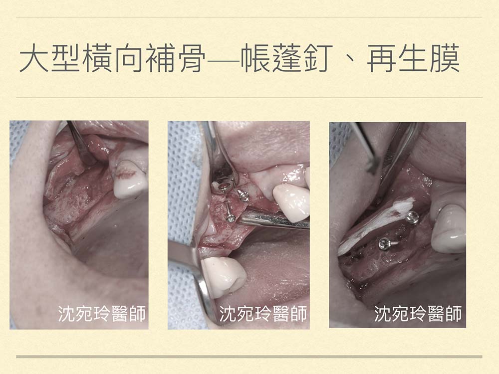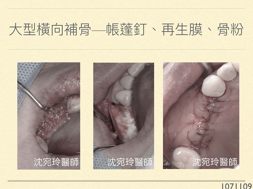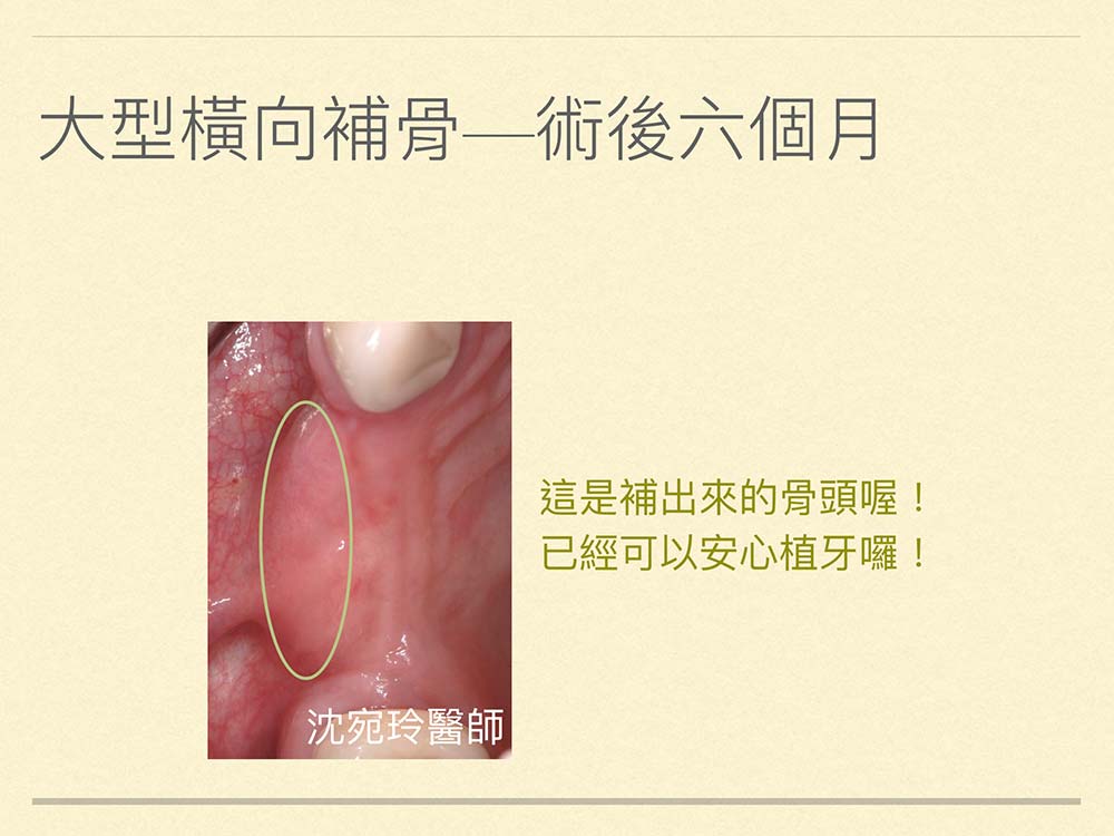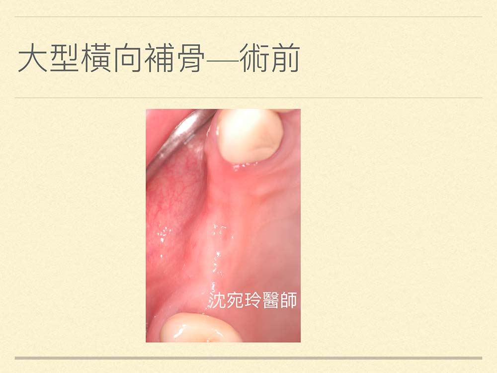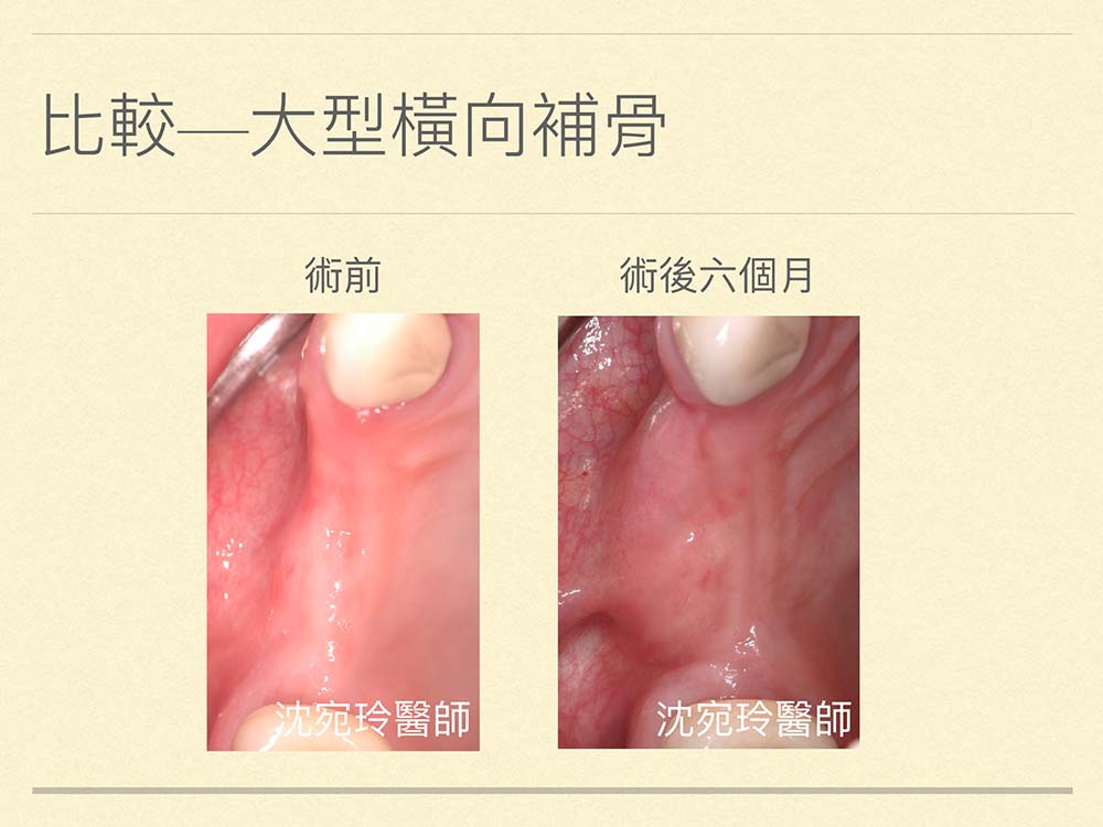 當然越大型的補骨,術式較繁雜,也很仰賴醫師的技術。而病患本身的骨頭也吸收比較多了,固然缺乏角質化上皮,之後也要將角質化上皮補足,才能讓植牙使用得長長久久喔!(請參閱前文:談植牙『角質化上皮移植手術』)