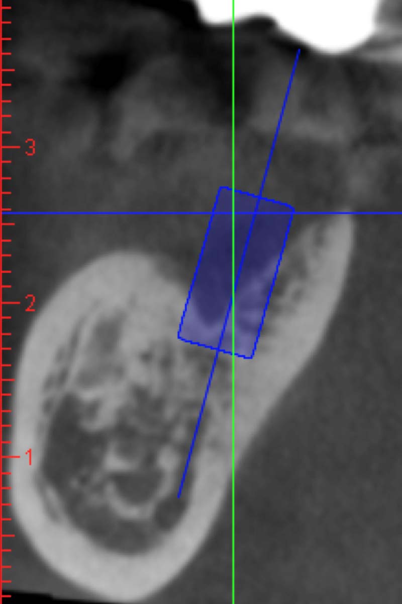 先生剛來診所時,為剛拔完拔牙二個多月,術前X光片呈現骨頭缺損嚴重、不利於植牙直接放入的情形。若逞時間之快,一開始就放入植體,往往會植入到過深的位置;除了讓將來植牙周圍不好清潔以外,另外易使牙冠/牙根比例太高(牙冠太長、植體較短,地基不足),因而植牙的生物力學也不佳,降低使用年限。