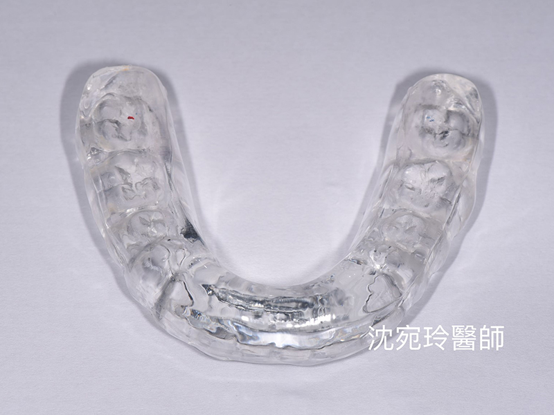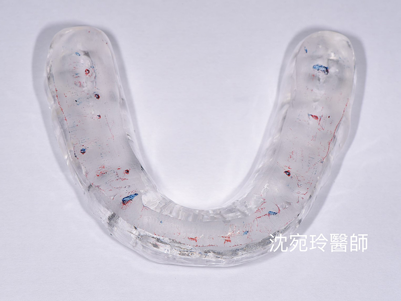 再仔細觀察,更可發現口內有磨牙表徵和手軸有外彎的軟骨易變形現象。經診斷,應為雙邊關節盤紊亂變形所致(disc displacement without reduction),建議配戴提高足夠高度的咬合板(如下圖),使病患休息時關節能保持在一個微微張開、又適合肌肉休息的位置,使關節盤有足夠的空間和時間得以修復。