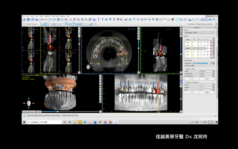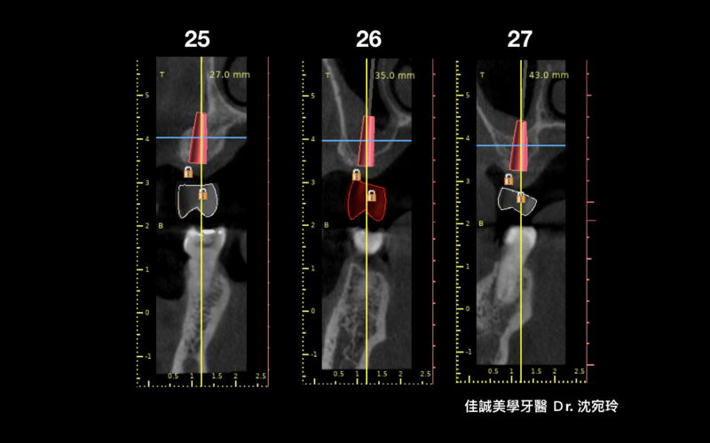 在上顎後牙區植牙手術前必須審慎評估的有: 上顎鼻竇的位置及健康,植體位置旁骨頭的量是否足夠,以及植體周圍角質化上皮的量是否充足。這個案例在電腦中分析,發現左上第一大臼齒區需要做先做鼻竇增高術及水平補骨才能植入植體,而另外左上第二小臼齒區則在植入植體時須合併做水平補骨,而左上第二大臼齒則須在植入植體同時做鼻竇增高術和水平補骨。這些補骨植牙手術都需要厚實的角質化上皮來幫忙,以防止補骨植牙術後腫脹期傷口裂開,提供手術成功的關鍵。另外,角質化上皮移植手術(FGG)在這個案例,也成功地提供一個將來牙刷在此區頰側清潔的空間,以防止植體周圍炎的產生。而我們也需要一段時間追蹤治療左上鼻竇黏膜,因此我們的治療計畫為先補角質化上皮,等待軟組織癒合穩定四個月後再依序重建。