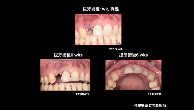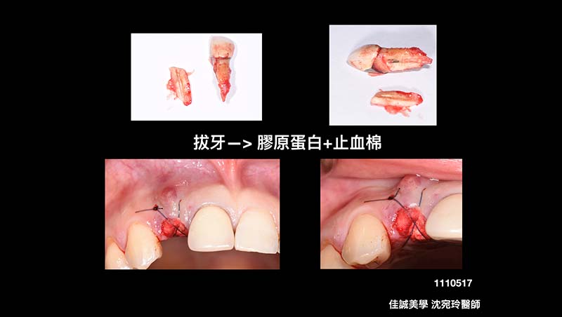 拔牙前我們審慎評估斷層掃描影像,在這個案例,我們選擇拔牙術後六週進行補骨重建的治療計畫。我們小心翼翼的將牙齒拔下來,避免損傷牙齒周邊軟硬組織,並在傷口清創乾淨後,放入膠原蛋白和止血棉,來增進軟組織癒合的質量。