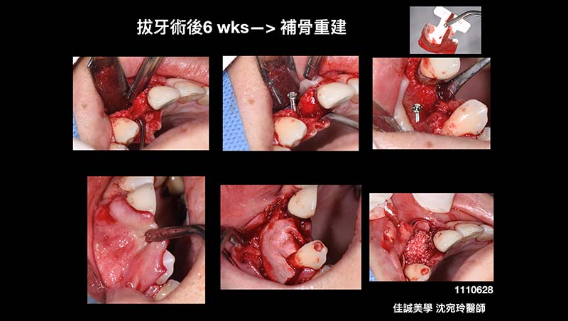 拔牙術後六週後進行補骨重建,我們利用水雷射將骨面及牙根表面清創乾淨,皮瓣組織適度減張,接著利用帳棚釘和骨粉及長效型再生膜,將牙嵴的外型重建,以利將來植體能植入最佳位置。由於水雷射的使用,讓骨粉更扎實緻密,將骨粉塑形成我們預想的外型,讓骨粉好好的讓長效型再生膜包覆。水雷射的運用也增進了傷口癒合的速度,術後的不適也降低許多。