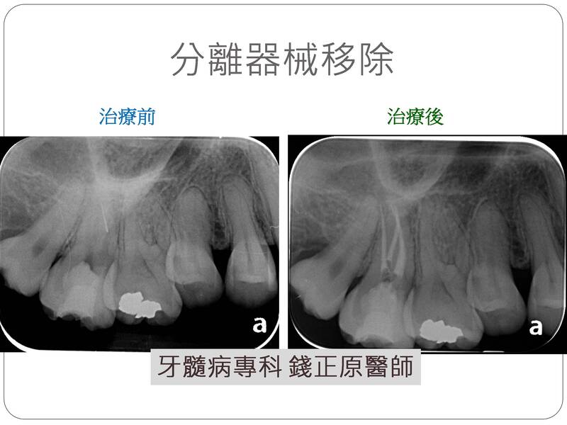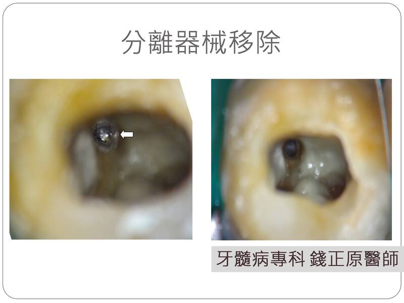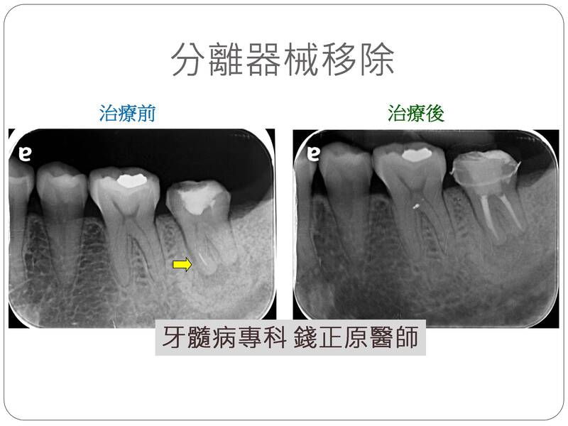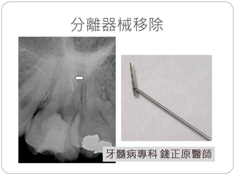 當分離(斷裂)器械發生時,主要的問題是會「卡住根管」,使醫師無法清創到根管內的細菌。因此,治療分離器械的方法為: