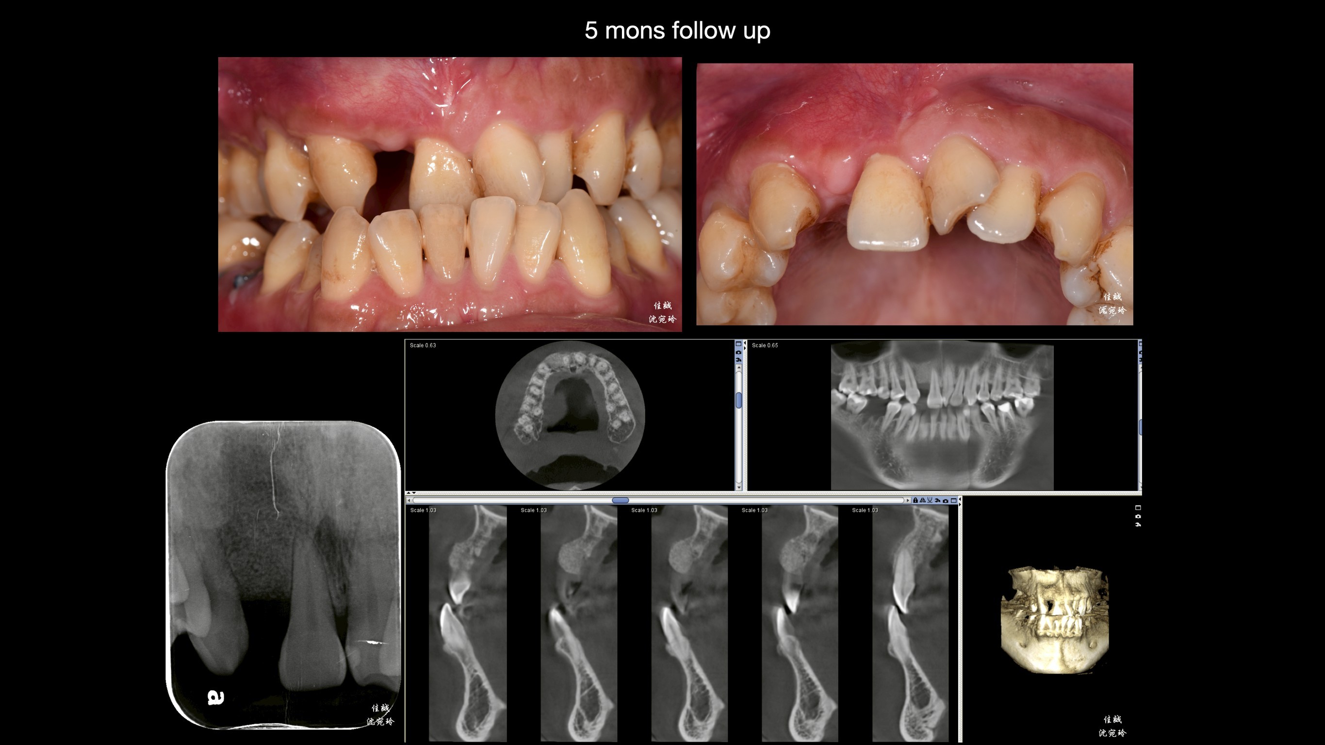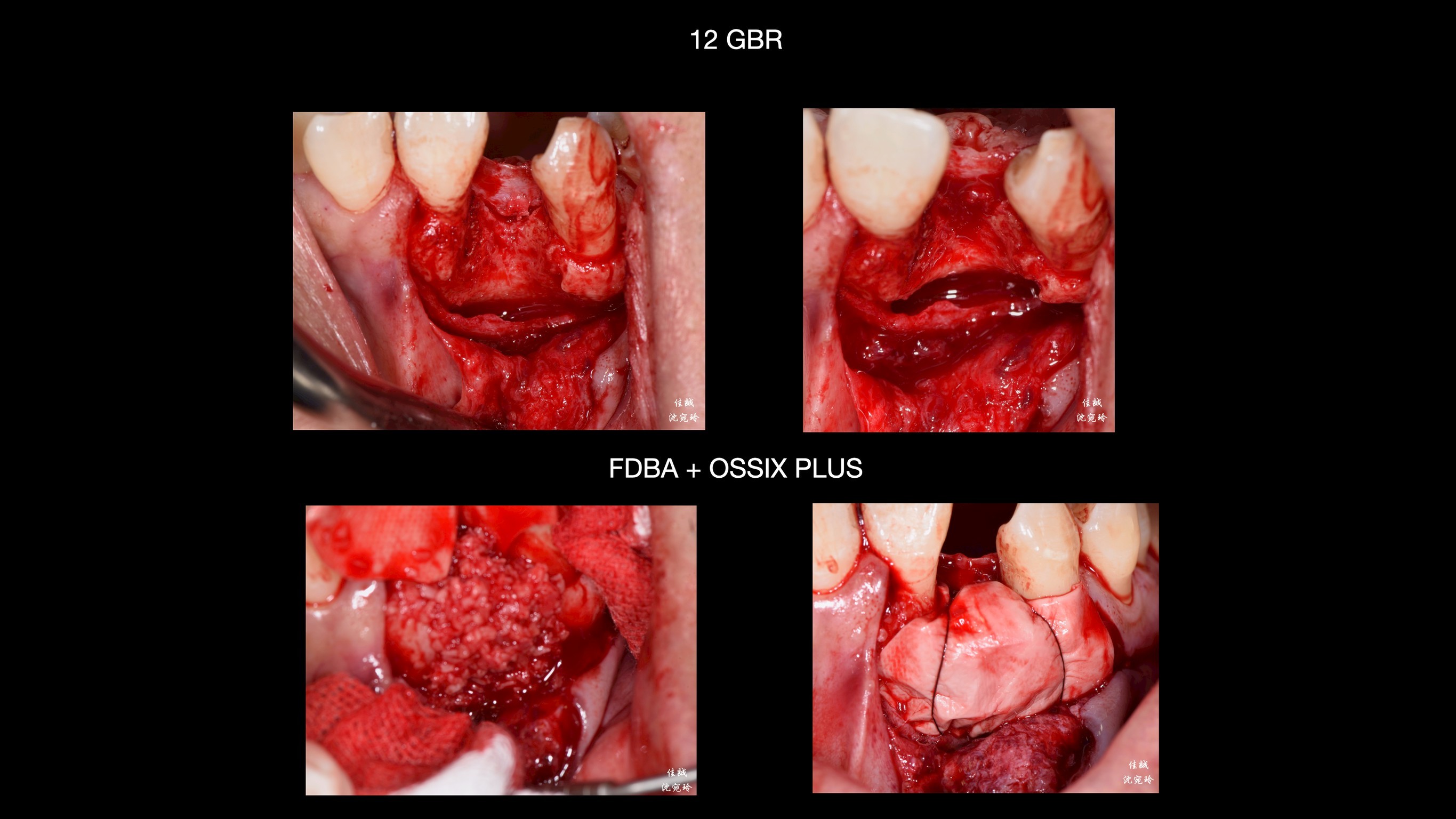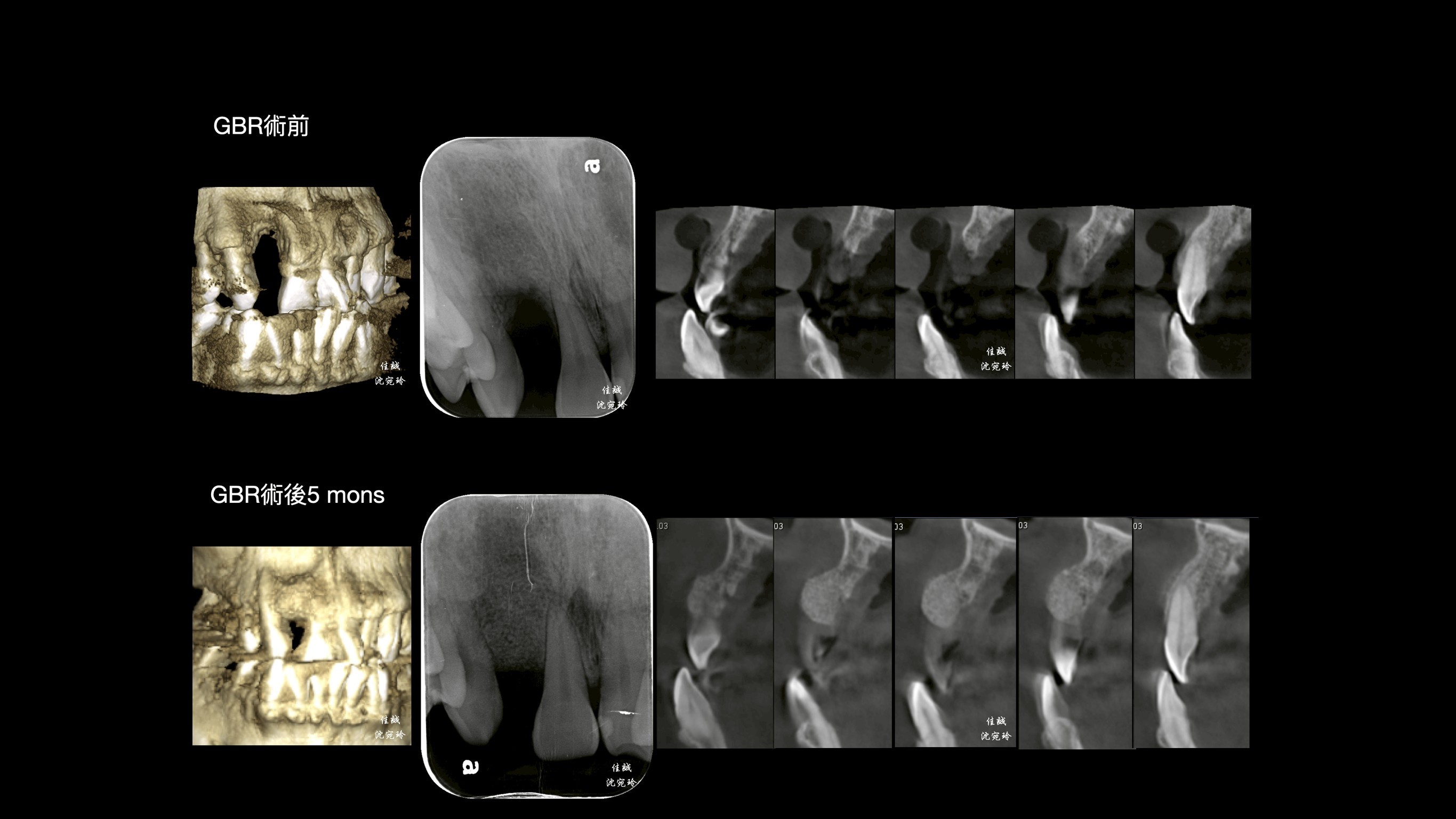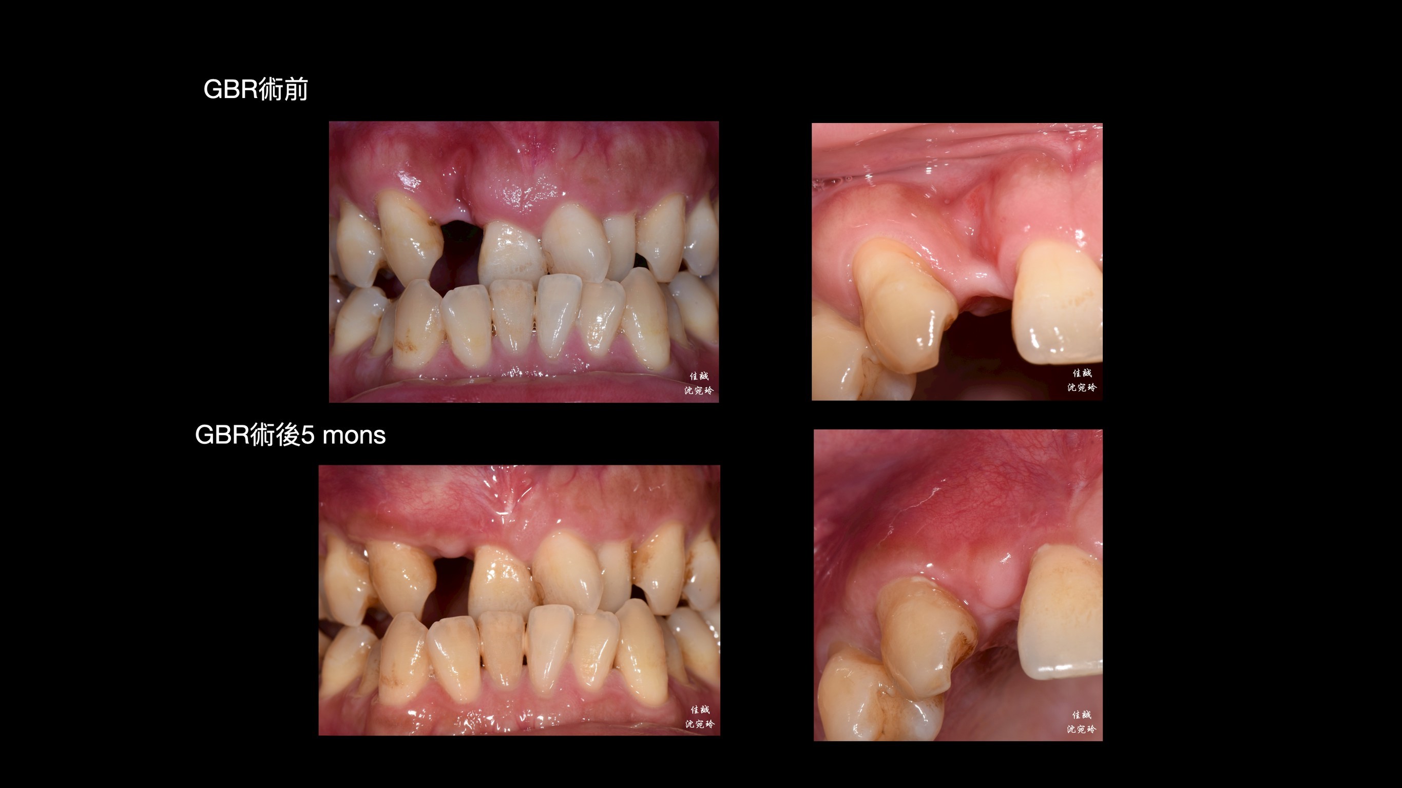 手術挑戰是術區牙齦皮薄、骨缺損大,加上病患希望矯正前只開一次手術,對於方便矯正的接續進行,這次只補FDBA和 OSSIX plus。因為預期將來會吸收一些,我盡量補oversize,最後選在牙齒掉落後的三個月進場,增加贏面。