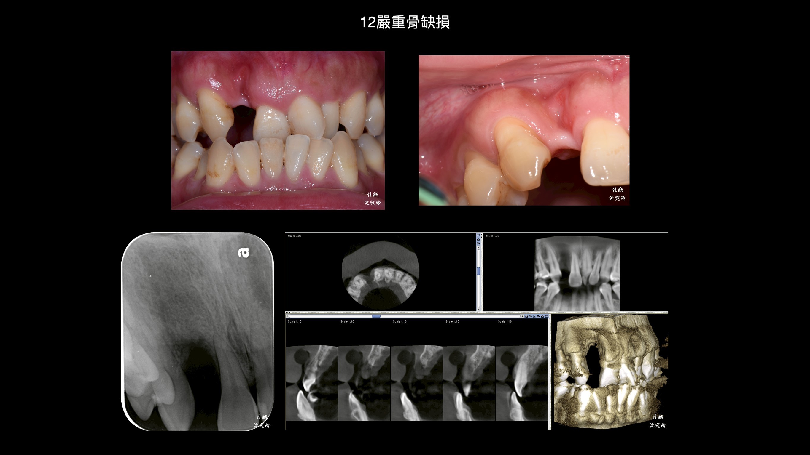 由於骨缺損程度大,此區若直接做假牙除了會塞食物,也不美觀。另外,做牙橋會犧牲太多齒質,需要根管治療;而馬里蘭牙橋做在平行度不佳的前後牙齒上面,也需要修磨較多,使用年限也不高;加上咬合排列不正,建議先做補骨手術,再接著做矯正治療,等矯正完成後,才做植牙或假牙的選擇。