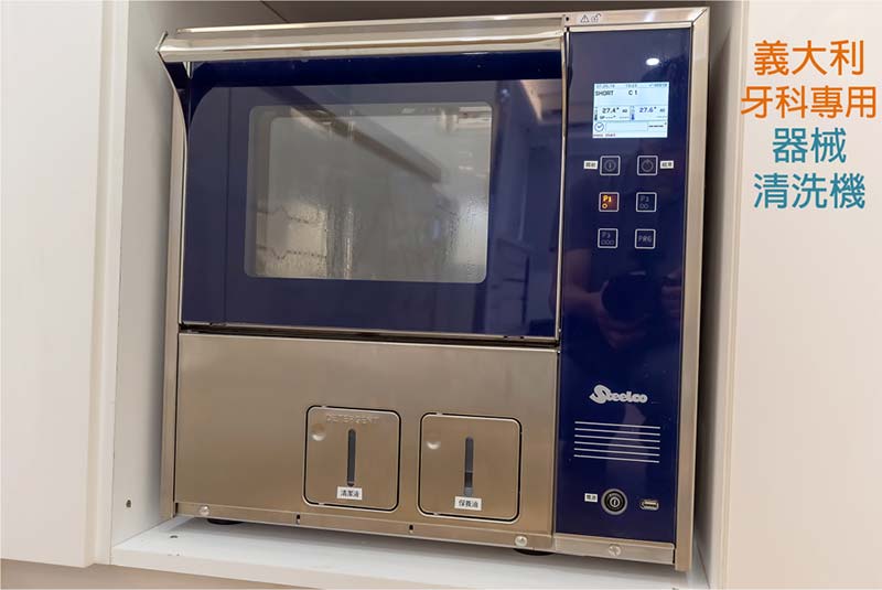 - 醫療專用器械清洗機(義大利進口):為教學醫院開刀房,器械消毒時的標準使用儀器,業界非常罕見。使用高溫水壓清洗器械表面,避免人工清潔不全,並且保護助理不被尖銳器械扎傷。機器內設有專門插槽,可以置放管狀器械(如牙科使用的高速手機),以噴射水柱清除管腔污漬。