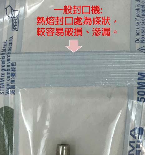 - 一般封包機,熱熔壓痕為條狀平行,尖銳器械較容易穿出滲漏。