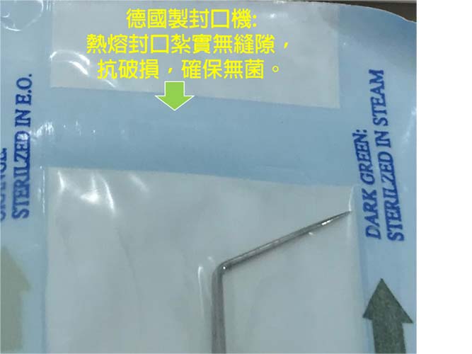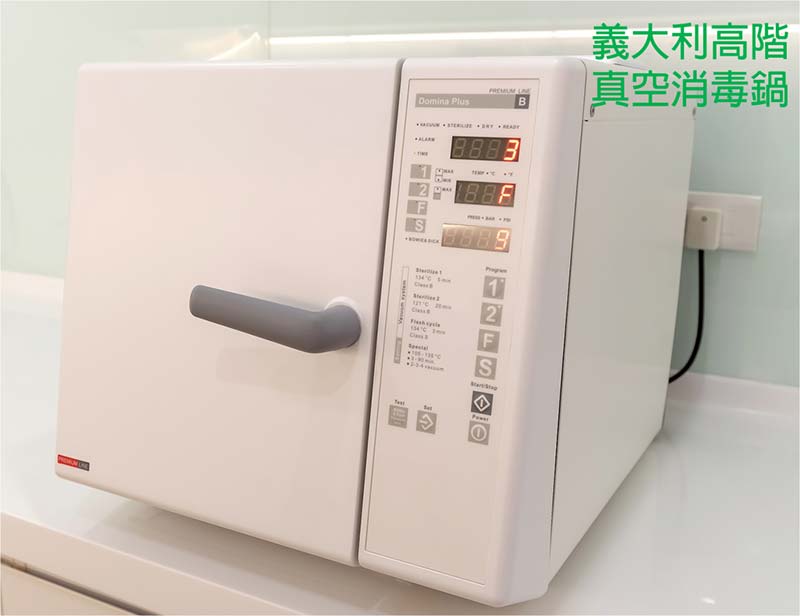 有別於傳統的消毒鍋,器械堆放時容易有封閉的死角,而死角內殘存的空氣會阻擋水蒸氣的進入,使消毒不全。我們使用歐盟認證的高階滅菌鍋,採3次預先抽真空處理,移除殘存的空氣,使後續的高壓水蒸氣能確實充滿消毒包的每個角落。