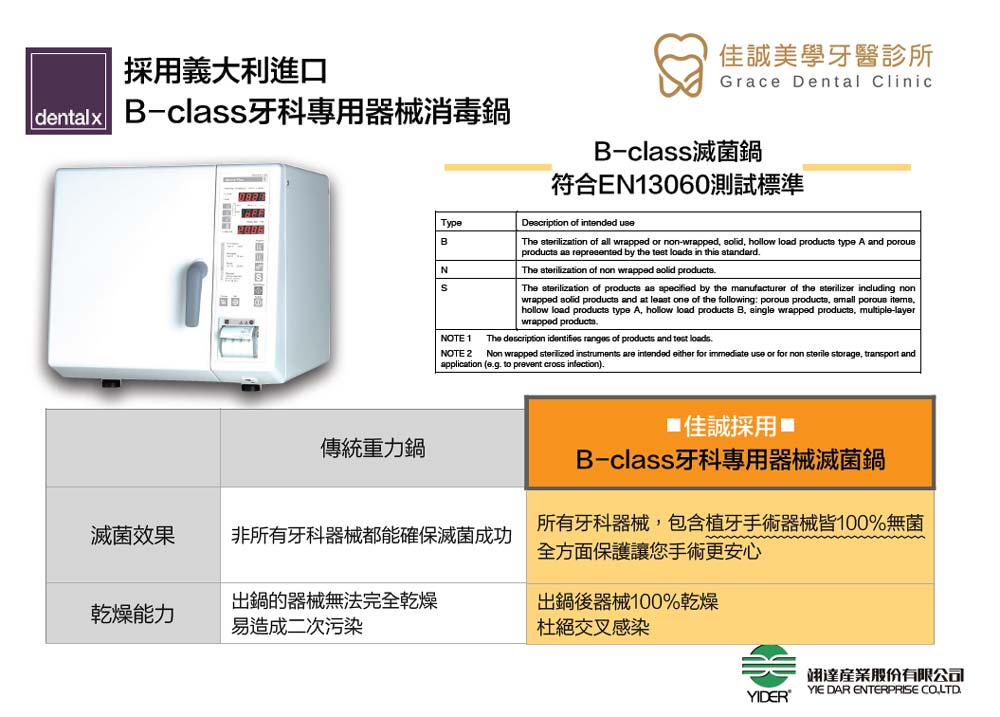 如同之前的文章:[佳誠美學牙醫,首重:器械消毒、滅菌] 中提到,在診所設立之初,器械消毒和醫療品質,一直是我們最重視的事情。我們設置的是歐盟認證的Class B真空型消毒鍋,因為根據英國學者在2017年的研究( *註一),相較於傳統的消毒鍋,使用真空型消毒鍋可以顯著的增加牙科器械的滅菌率,達到100%滅菌。因此儘管兩者設備成本相差數十倍,但我們願意把有限的資金,換得病人的安全、安心。