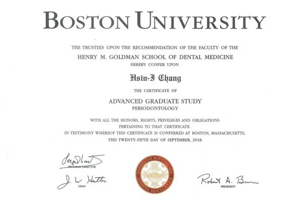 - 美國波士頓大學牙周病科碩士